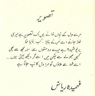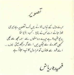 The poem above is written by Fahmida Riaz. She is a well known Urdu writer, poet and feminist. Along with Zehra Nigah, Parveen Shakir and Kishwar Naheed, Riaz is amongst the most prominent female Urdu poets. She is the author of Godaavari, Khatt-e Marmuz, and Khana e Aab O Gil, the first translation of the Masnavi by Jalauddin Rumi from Farsi to Urdu and she has also translated the works of Shah Abdul Latif Bhitai and Shaikh Ayaz from Sindhi to Urdu.
