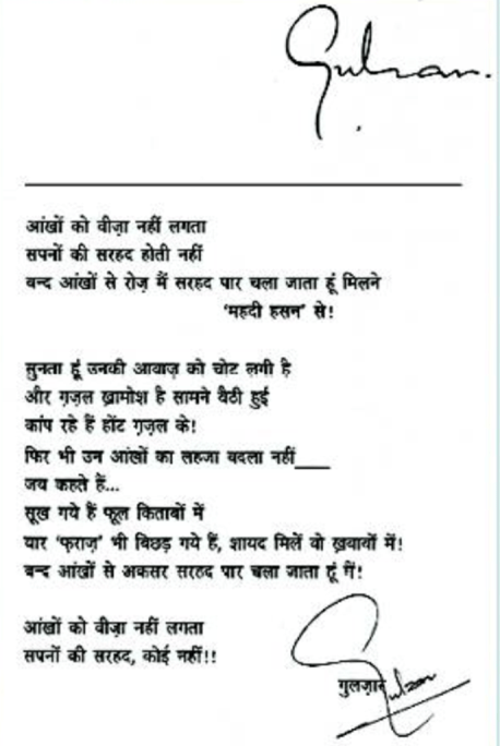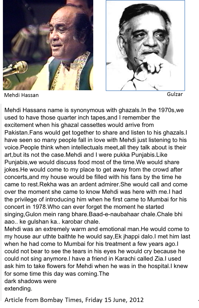 The poem that Gulzar penned as a tribute to Mehdi Hassan in January 2010 as part of Aman ki Asha is below. It couldn’t be sheer coincidence that the two legends were both in each others country, Gulzar in Pakistan and Hassan in India.