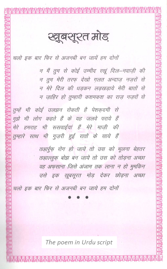 Here is one of Sahir Ludhinavi’s best works – Khubsoorat Mod. The poem appeared as a song in the film Gumrah, released in 1963, directed by B.R. Chopra.